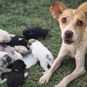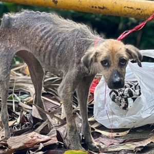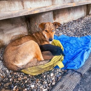 In a forgotten stretch of dry, desolate land, a thin dog stood silently, her ribs showing through her coarse fur, her eyes filled not with fear for herself, but with quiet desperation for…