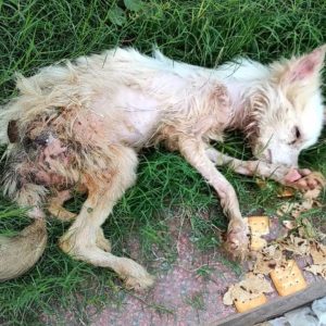When rescuers first found KFC, he was barely recognizable as a living, breathing dog. At just four years old, he looked like a fragile shadow of what he should have been—skin stretched tightly…