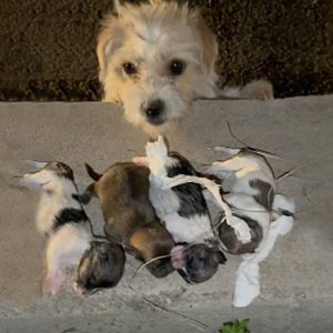 In the middle of a freezing, rain-soaked mountain landscape, where the wind cuts through layers of clothing and the ground stays slick and unforgiving, a mother dog stood guard over her newborn puppies….