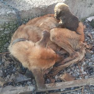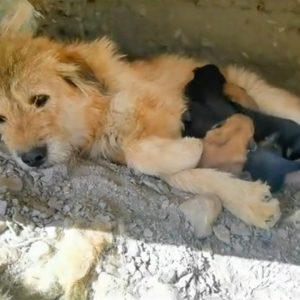 At a deserted construction site, in a shallow hole carved into the frozen earth, a mother dog lay curled tightly around her six newborn puppies. Her body was little more than skin and…