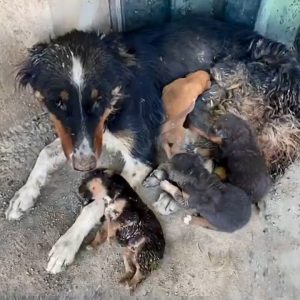 A frail mother dog lay motionless, her body weakened beyond what most would survive, yet her eyes remained fixed on something more important than her own pain. Curled tightly around her were six…