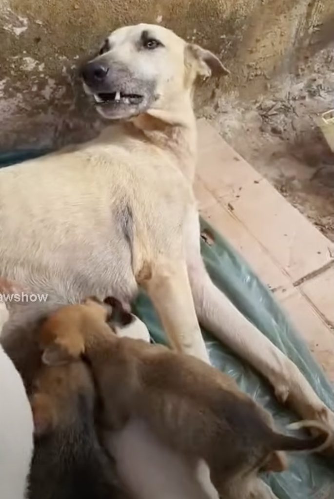 When local rescuers heard about her condition, they rushed to the site. What they found broke their hearts. Hope was lying motionless on the cold ground, her body trembling from exhaustion, surrounded by her newborn pups who nestled close to her for warmth. She could barely lift her head, but when she saw the rescuers approach, her eyes — though tired and clouded with pain — held a spark of trust, as if she somehow knew that help had finally arrived.