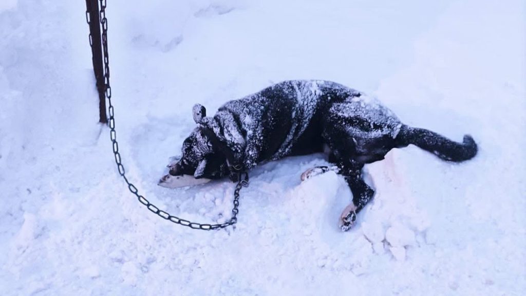 In the quiet stillness of a bitter winter morning, a passerby heard the faint sound of whimpering coming from behind a small, snow-covered house. Following the noise, they found Jem — a frail, trembling dog chained tightly to a post in the freezing snow. His thin body quivered violently with every breath, his fur crusted with frost, and his eyes filled with a silent plea for mercy. It was clear that Jem had been left there for far too long, exposed to the brutal cold without food, warmth, or compassion.