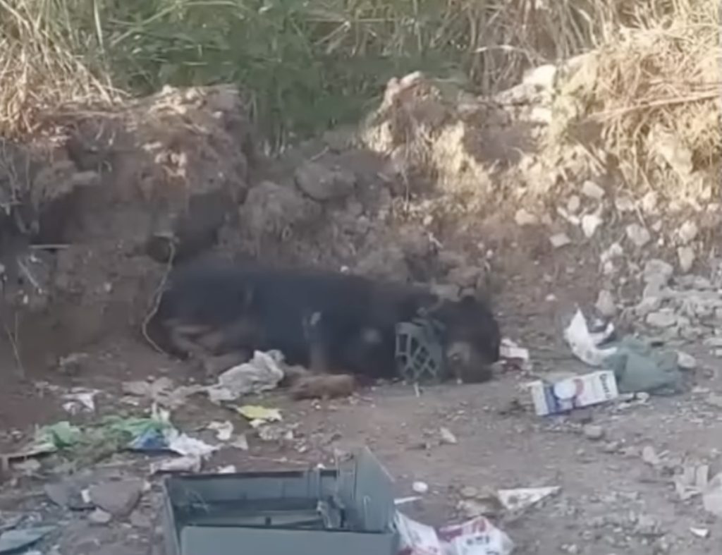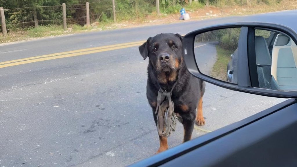 The man pulled over, feeling a lump form in his throat. He wasn’t equipped to take in another animal—his small shelter back home was already full—but there was no way he could just drive away. He found an old can of food in his car and gently offered it to the dog. The poor creature struggled to eat, still muzzled and weak, but wagged his tail with a kind of cautious gratitude. The man could see it in his eyes—the dog was starving, thirsty, and broken, yet still trusted humans enough to accept kindness. Knowing he couldn’t leave him there alone, he made a call for help to a local rescuer he knew.