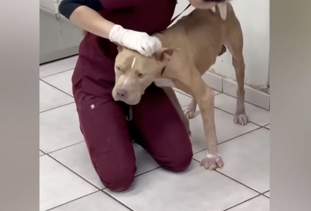 At the veterinary clinic, the truth of his condition became undeniable. Gator’s body condition score was 1 out of 9—the lowest possible rating, indicating extreme starvation. The veterinarians worked quickly to stabilize him. His paws were cracked and swollen from standing too long on rough ground. His skin was raw in places, and his ears were painfully infected. Despite all that, he never snapped or growled. When a vet softly stroked his head for the first time, he froze—not out of aggression, but confusion. He simply didn’t know what kindness felt like.