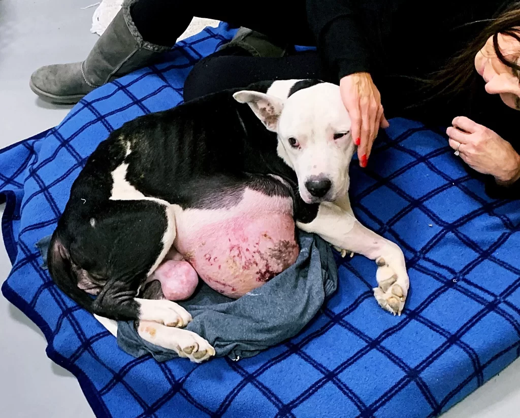 When Nina arrived, the sight broke everyone’s heart. She was painfully thin, her ribs visible beneath her dull coat, and two large growths hung from her abdomen—one massive and another smaller, both heavy and uncomfortable. Her back legs were covered in sores from a severe skin infection, and her body trembled from exhaustion. Despite her condition, there was still a spark in her eyes—a quiet, pleading hope that someone might finally care for her.