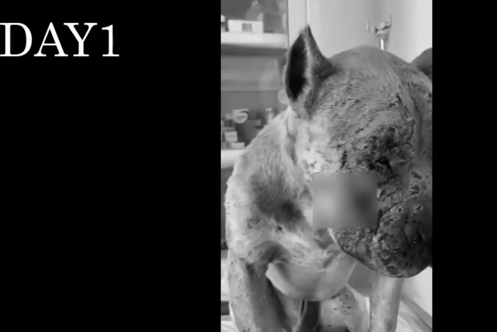 When rescuers first found him, his face was unrecognizable. Deep cuts and swelling distorted his gentle features, and his eyes, once bright, seemed lost in a fog of pain and fear. They rushed him to the hospital, where doctors immediately began treatment. He was placed on heavy doses of painkillers and antibiotics, his head wrapped carefully in soft bandages. Despite his young age—barely two years old—his spirit was shattered. He would not eat, would not move, and could hardly lift his gaze. It was as if he had given up on the world that had failed him so completely.