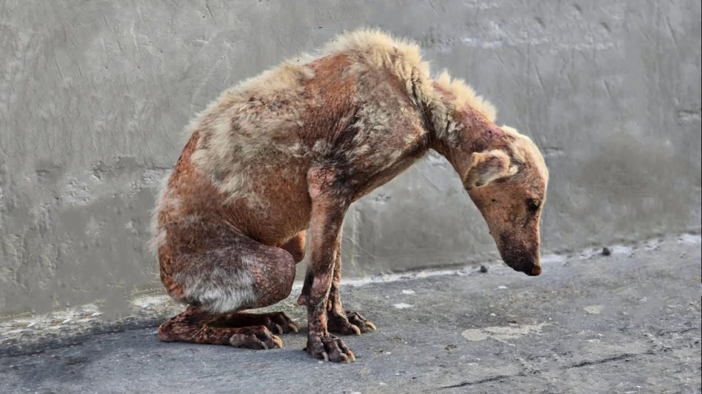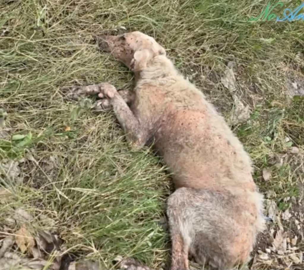 Bueno’s story begins on a hot afternoon outside a small shop. His body was ravaged by mange so severe it had stripped away nearly 80% of his fur, leaving his skin raw, cracked, and painful under the scorching sun. Each step he took was heavy with exhaustion. His eyes, though dulled by pain, still held a flicker of longing—longing for food, comfort, and above all, kindness.