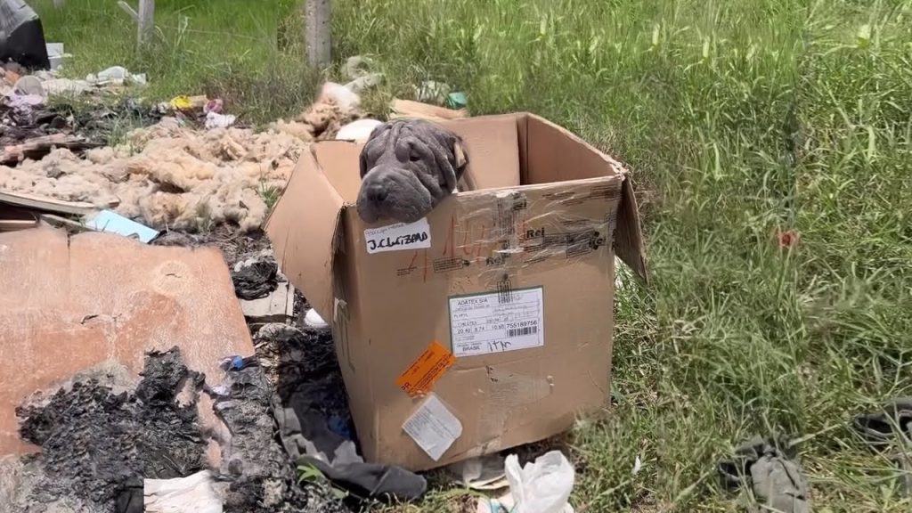 She was a Shar-Pei, with beautiful, wrinkled skin and a gentle soul. When rescuers found her, she had just given birth and had been dumped on the side of the road in a broken-down cardboard box. Blind, weak, and clearly in pain, she waited there — for two whole days. She didn’t move, not because she couldn’t, but because she believed her owner would return. That faith was all she had left. The box was dirty, barely shielding her from the cold, but she stayed there, curled in on herself, clinging to the memory of a home that had never truly loved her.