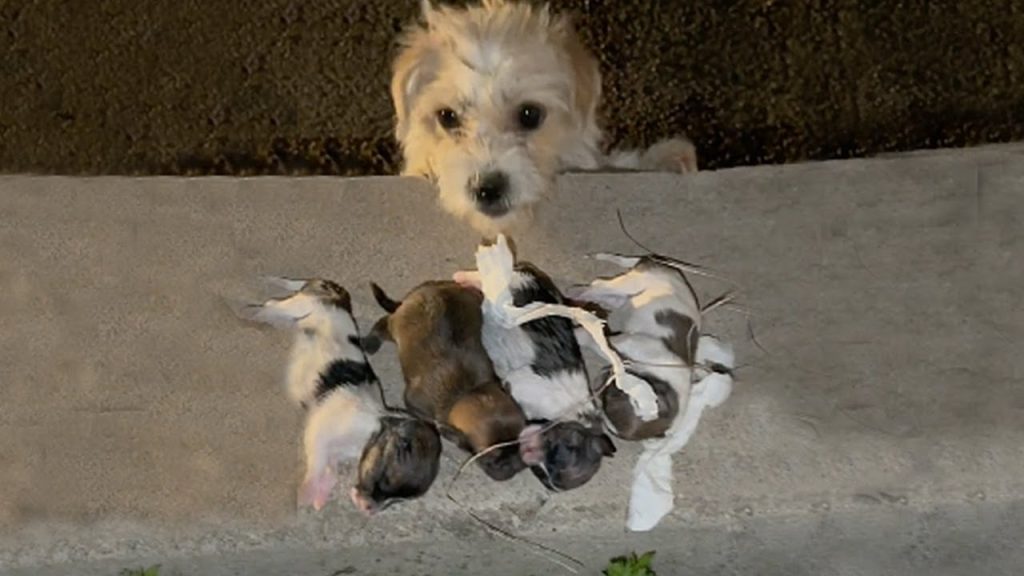 She had chosen the narrow space by the fence because it offered the slightest protection from the wind. Her body trembled, not only from the cold but from exhaustion. Five tiny puppies lay close against her belly, searching instinctively for warmth and nourishment. In that moment, survival depended entirely on her.