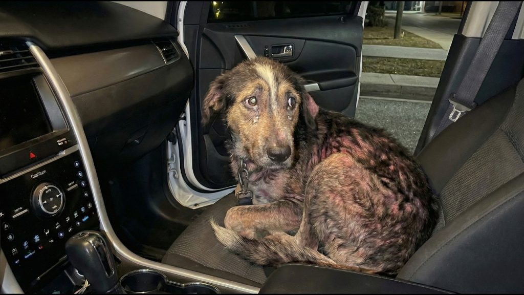 JD didn’t bark or growl when he leapt into the woman’s car. He simply jumped in and sat down, as if he knew this was his one chance. His body told a painful story. Large patches of fur were missing. His skin looked inflamed and irritated, marked with raw areas that must have stung with every movement. He was thin, exhausted, and clearly had been struggling alone for far too long. But in his eyes, there was something stronger than fear. There was hope.