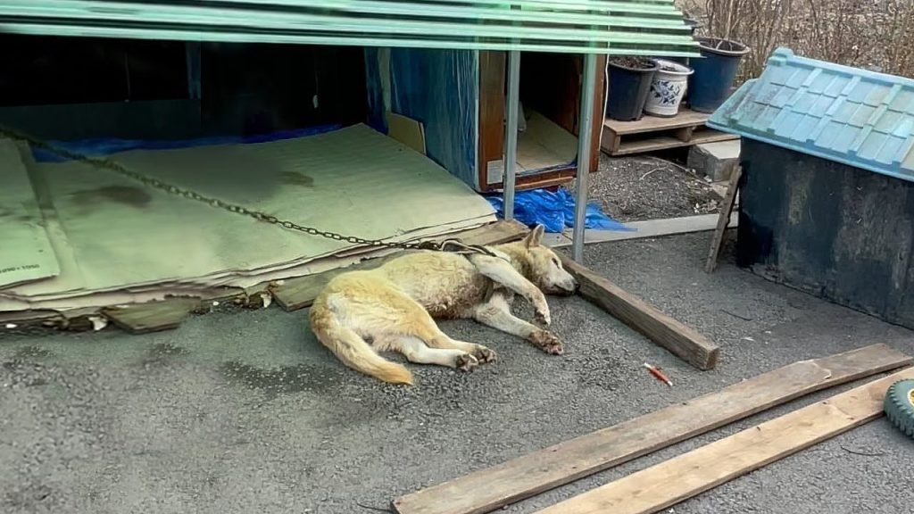 By the time rescuers arrived, Haeng-un was no longer able to stand. His body had weakened to the point where even lifting his head seemed impossible. He lay motionless, his breathing shallow and labored, as if each breath required more strength than he had left to give. It was a heartbreaking sight, not just because of his physical condition, but because of the quiet endurance written into his eyes. This was a dog who had given everything he had, and yet had been left with nothing in return.