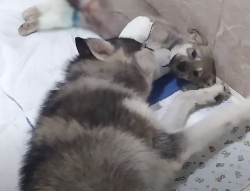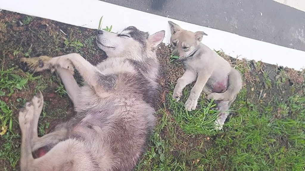 The story begins with a deeply emotional scene that would tug at anyone’s heart. A husky mother and her tiny puppy had been struck by a car and cruelly left behind by the driver, dragged to the side of the road as if they didn’t matter. The mother dog lay unconscious, completely still, while her helpless little pup cried out beside her. The tiny one was injured, scared, and desperate, nudging his mother’s body and whimpering, trying to wake her up. It was a heartbreaking picture of love, innocence, and despair all at once.