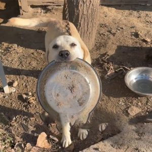 Chained in a Narrow Alley, The Dog Patiently Holds An Old Bowl, Begging Passersby for Food Every Day